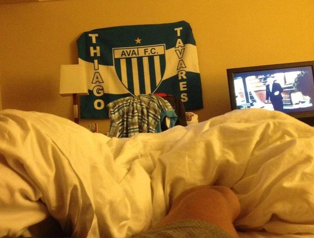 Thiago Tavares deitado na cama do hotel com a visão da bandeira do Avaí (Foto: Reprodução/Twitter)