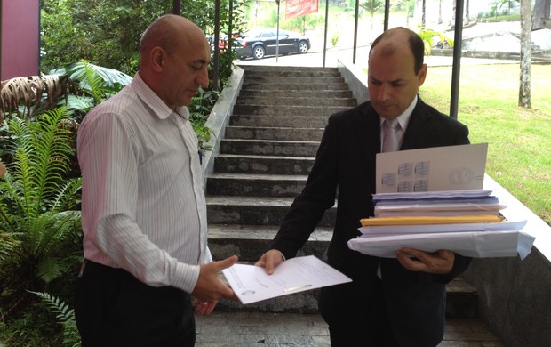 Sandro Barreto, advogado da SCClubes entrega os documentos para Bertoncini (Foto: Paulo Evangelista)